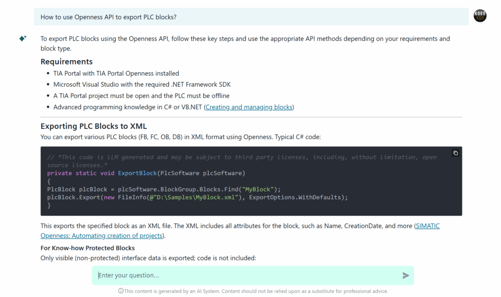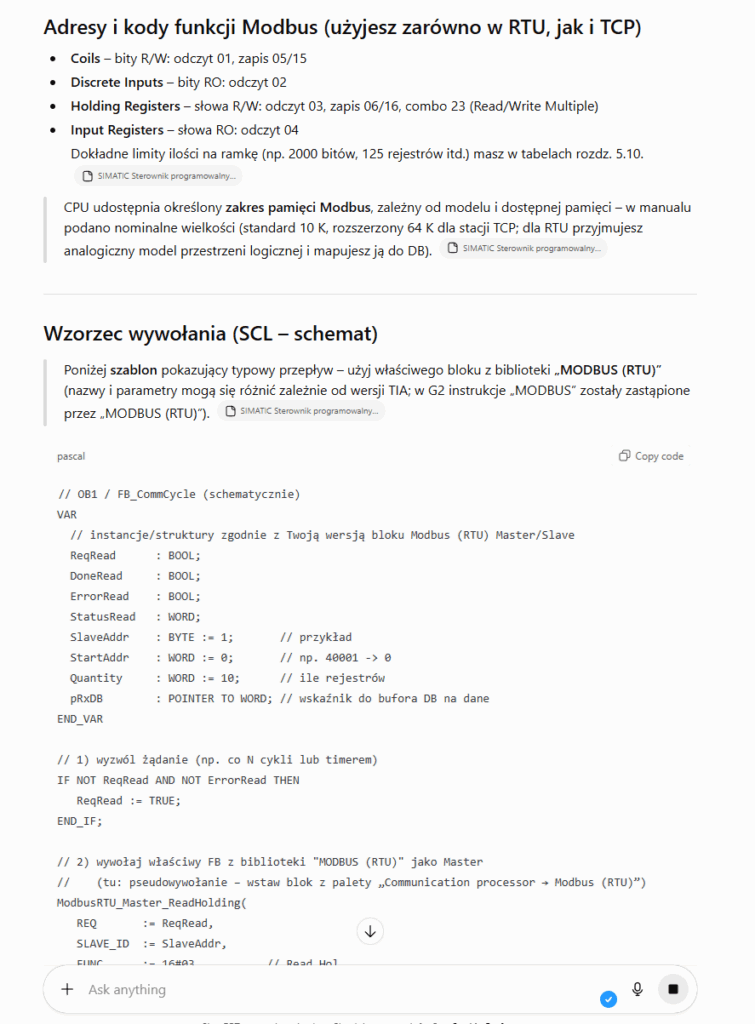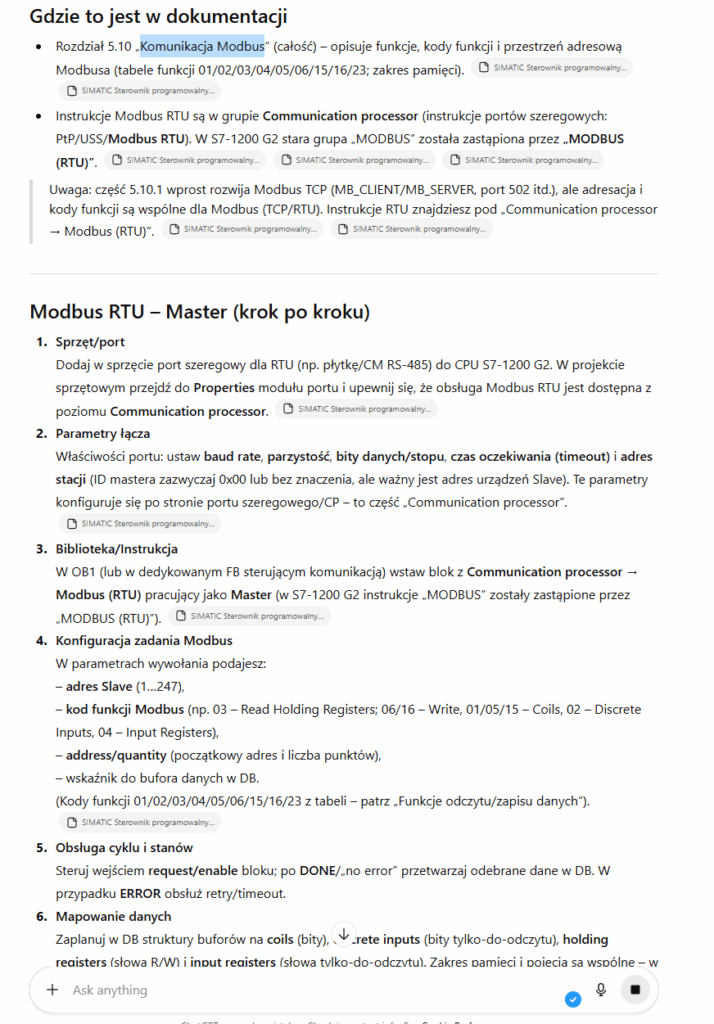Dzięki temu nie musisz już ręcznie przeszukiwać stron „Manuals”, PDF-ów i not aplikacyjnych. Wystarczy wpisać pytanie, a system przeszuka wszystkie dokumenty TIA Portal, S7, ET200, HMI, Sinamics, Safety i poda gotową odpowiedź z cytatem z dokumentacji.