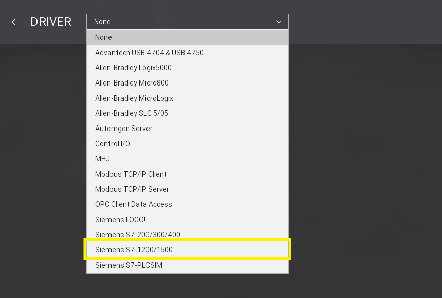 - Wybierz z listy sterowników Siemens S7-1200/1500.