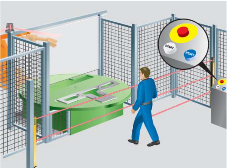 👉 Dlatego w takich aplikacjach stosuje się dodatkowy przycisk resetu, za pomocą którego operator potwierdza, że strefa jest wolna i można ponownie uruchomić maszynę.