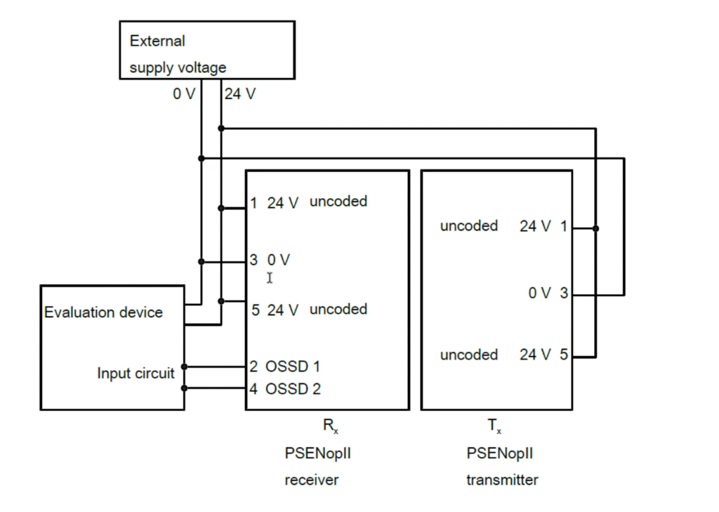Schemat jest bardzo podobny do kurtyny bez resetu. Kurtyna ma dwa wyjścia OSSD (Output Signal Switching Device):