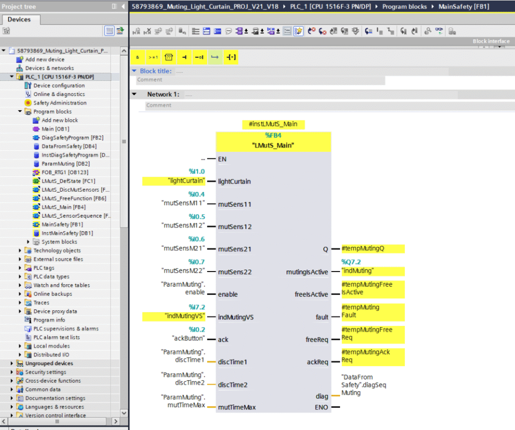 Do implementacji logiki mutingu wykorzystujemy bibliotekę Safety Functions w TIA Portal, która zawiera dedykowane bloki do obsługi kurtyn świetlnych i czujników.