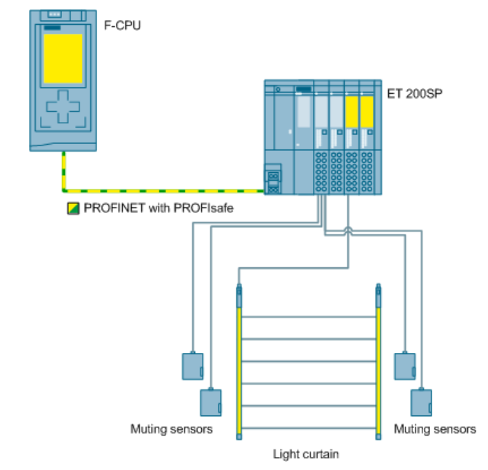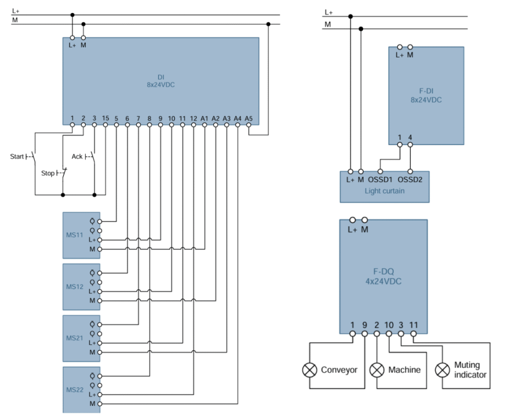 - Czujniki mutingu → wejścia standardowe lub Safety, zależnie od rozwiązania.