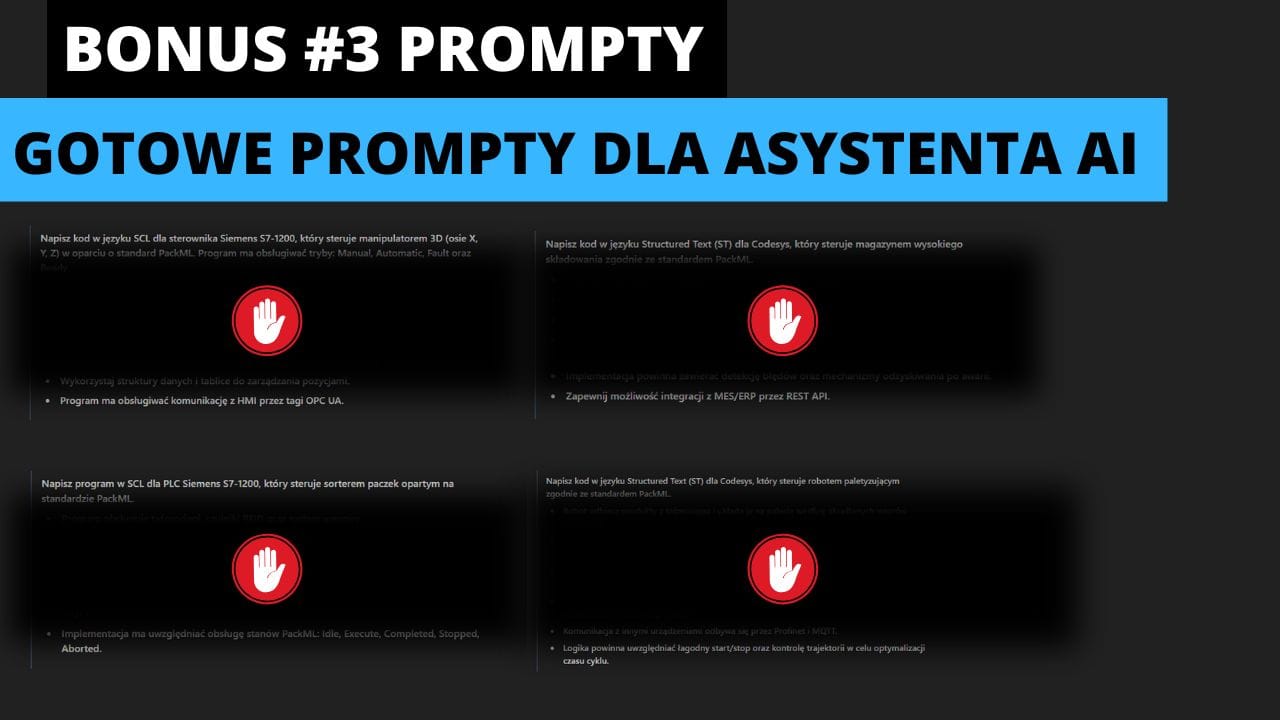 Materiały dydaktyczne, 30 lekcji w formie video, objaśniające zagadnienia programowania projektów PLC wraz z pomocą AI. Poprzez materiały video poprowadzimy Cię krok po kroku od prostych zagadnień po zaawansowane projekty
