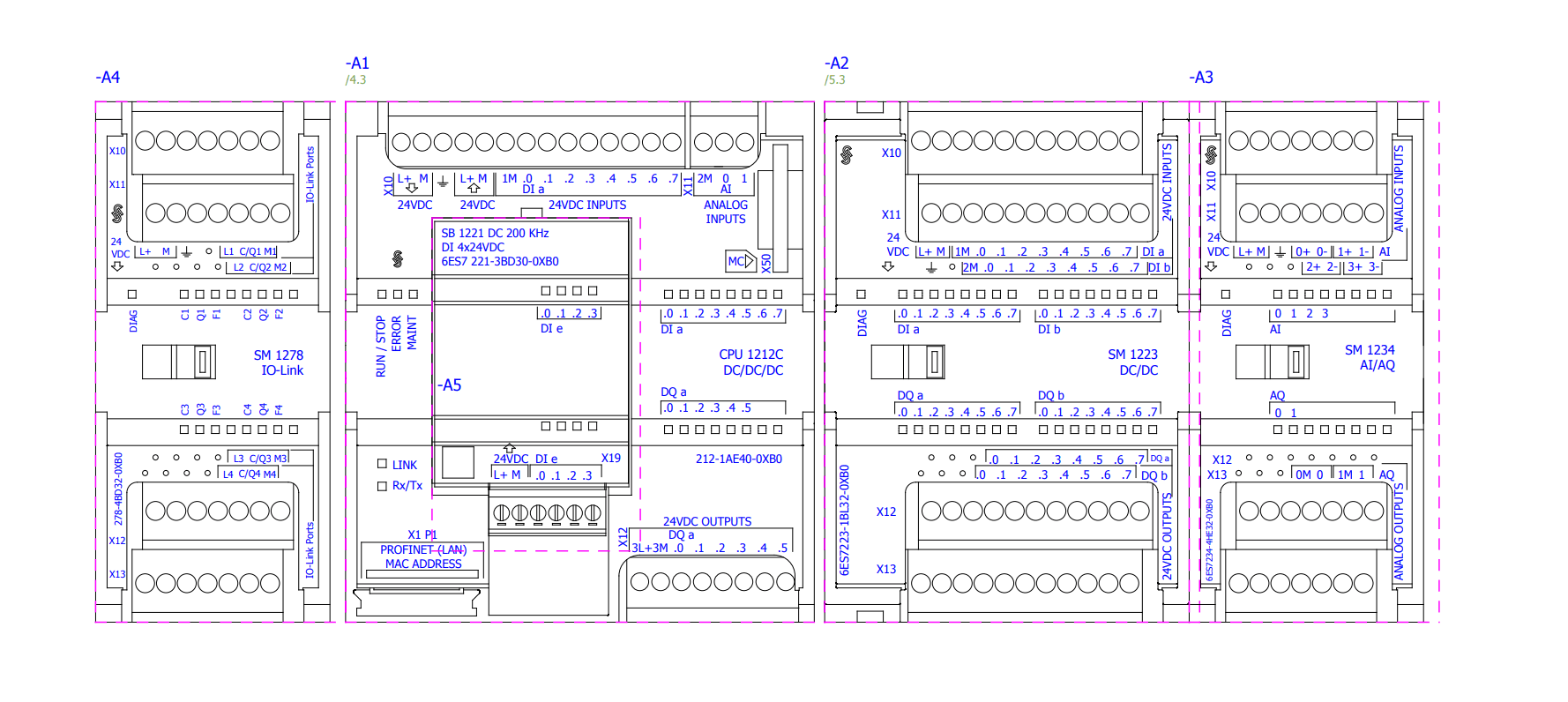 Przedstawienie sterownika w oddzielnych blokach – poprzednia reprezentacja w przypadku dużej ilości połączeń staje się mało czytelna i zbyt obszerna dlatego stosuje się podział sterownika na mniejsze moduły.