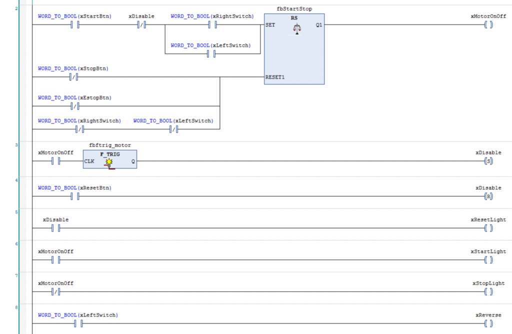 Na początku przygotowałem prosty program w LAD. Zawiera on klasyczny układ start-stop z podtrzymaniem oraz przeniesienie wartości z potencjometru na wyjście analogowe.