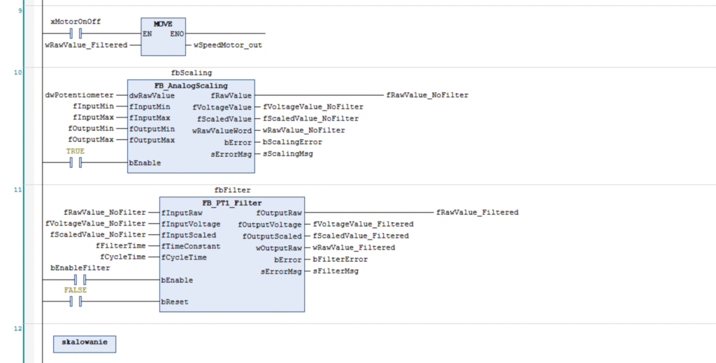 Wartość z potencjometru w CODESYS ma zakres 0–10000 (odpowiadający napięciu 0–10 V). Aby ułatwić interpretację, napisałem prosty blok funkcyjny FB_AnalogScaling w języku ST.