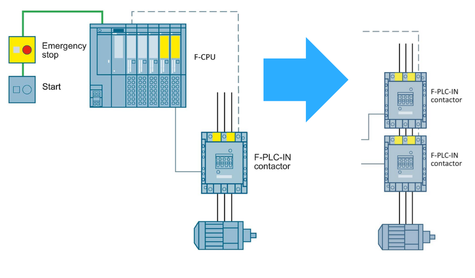 Dzięki zastosowaniu dwóch styków i dwóch styczników osiągamy wyższy poziom bezpieczeństwa (SIL3/PL e).